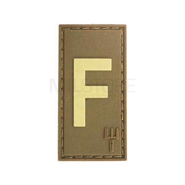 Pitchfork Letter F Patch - Tan. Velcro backed. Dimensions: 50 x 25mm.