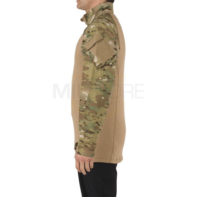 Featuring a unique dual fabric construction, the Rapid Assault Shirt consists of a poly/cotton/spandex knit body section that offers an agile and flexible base with moisture wicking and quick drying properties, along with ultra-durable poly/cotton ripstop sleeve sections that can withstand the harshest environments. A saddle shoulder design takes the weight of body armor without pinching or bunching while providing full freedom of movement. Large shoulder pockets provide quick and convenient storage, mesh panels offer enhanced breathability, and the integrated woven collar can be worn up or down.