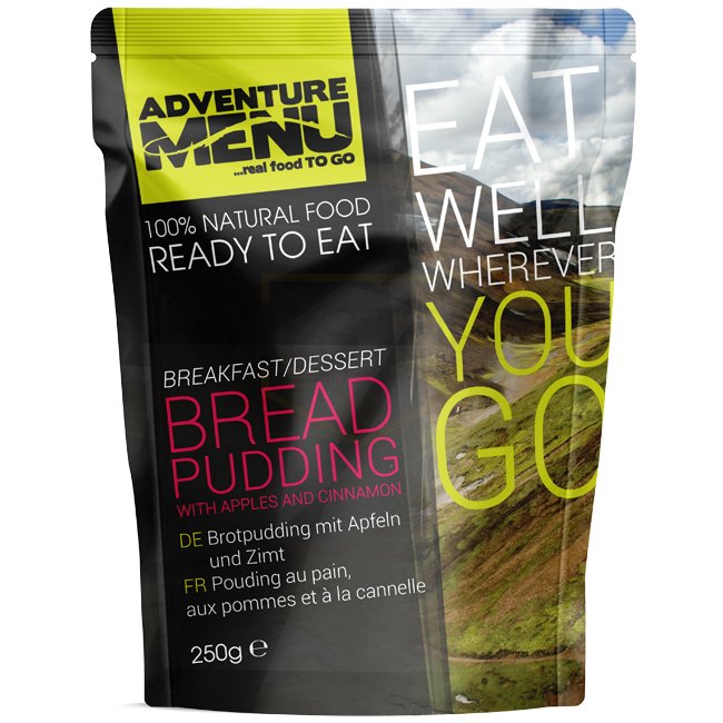 Adventure Menu Bread Pudding with Apples & Cinnamon - READY-TO-EAT, STERILISED MEALS. Highest comfort and premium ingredients, enjoy juicy apples, cinnamon, and cream cheese in this delicious bread pudding. Perfect for travel breakfast or dessert. 442.5 k