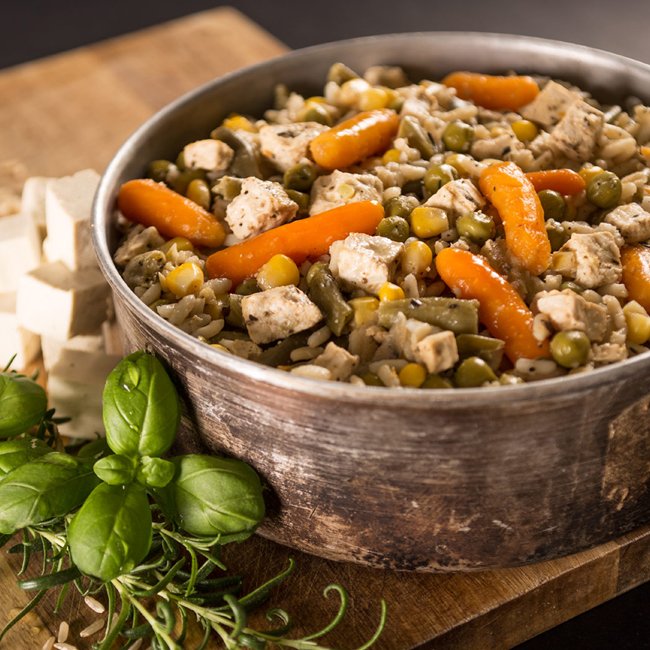 Composition: Vegetables 54% (green beans, baby carrots, peas, corn, tomatoes, onions, peppers), parboiled rice 25%, tofu 20% (soya, sea salt Nigari), rapeseed oil, salt (salt, potassic iodide), Provencal herbs, cumin, pepper, chilli