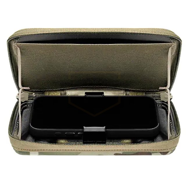 The Agilite Battleshell Phone Pouch is a universal solution for carrying any smartphone or electronic device, with or without a case. It mounts directly to plate carriers, chest rigs or any MOLLE platform, offering hands-free access and clear visibility to your screen during operations. Its thermoformed construction provides impact resistance, while the angled position ensures your reloads remain unhindered. The moveable mounting interface prevents accidental button presses and allows quick, one-handed deployment. Additional features include dual charging cable ports, an internal document sleeve, and a Velcro panel for patches or identification.