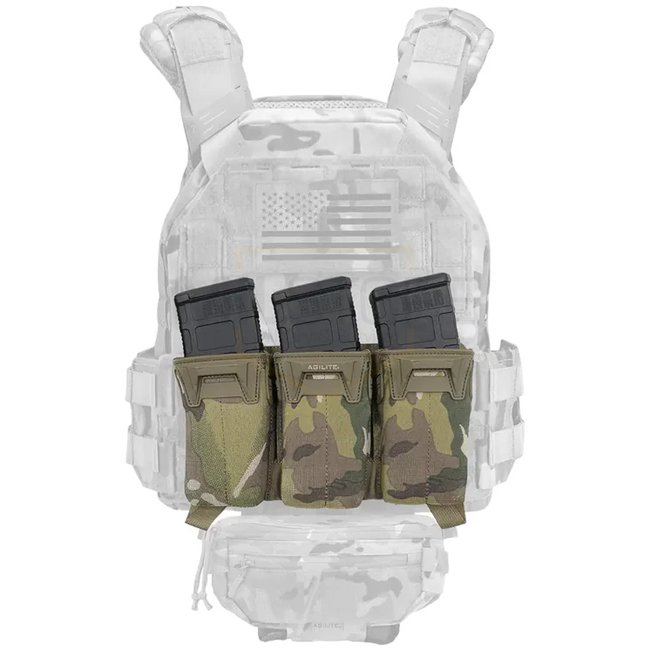 Agilite Pincer Placard Multi-Caliber Triple Mag Pouch - Multicam: Fast-draw, patented funneled magwell design for AR15/M4, AK, SG55X rifle mags or 6 extended pistol mags with Mag Splitters. MOLLE buckles, G-hooks included.