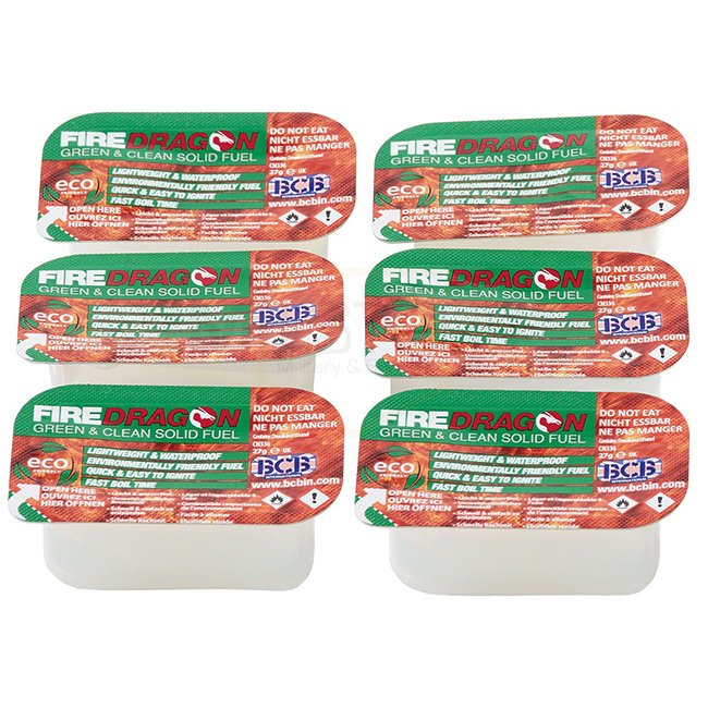 BCB Fire Dragon Safer Solid Firelighter - 6 pcs. Non-toxic, eco-friendly, quick to ignite. Burns clean with low soot, in all weather conditions. Also usable as hand cleanser. Dimensions: 5.5 x 2.5 x 2.5 cm. Material: denatured ethanol.