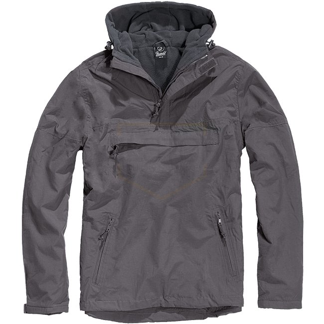 Stylish Brandit Windbreaker in Anthracite, size M. Fleece lined with wind and water repellent features. Comes with an extra long side zipper, velcro sleeve cuffs, and zip pockets. Made of 100% polyester with a polyester lining and elastic strings.