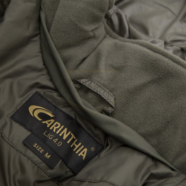Carinthia LIG 4.0 Jacket - Olive - S is a water repellent jacket with adjustable collar & stowable hood, soft inner collar made of thermal fleece, large outer pockets, internal wrist warmer, adjustable drawcord at waist, and integrated storage bag. Insula