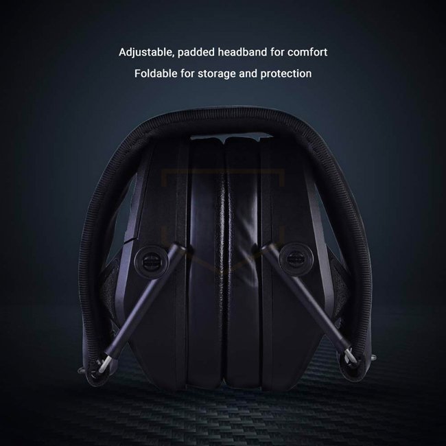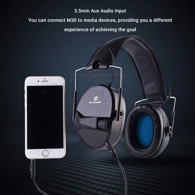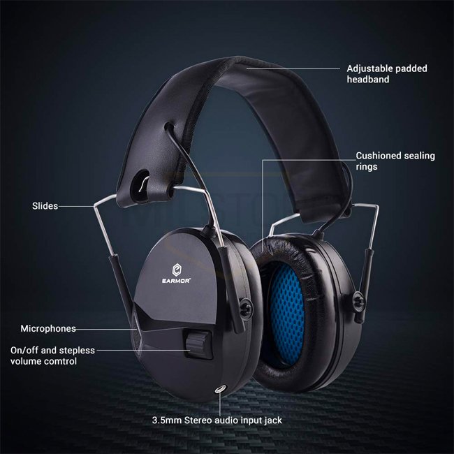 Earmor M30 Hearing Protection Ear-Muff in Black color offers low profile design, advanced volume adjustment, AUX audio input, NRR22 noise reduction rating, dynamic voice tracking, IPX-5 water resistance, and foldable storage. Ideal for enhancing speech in