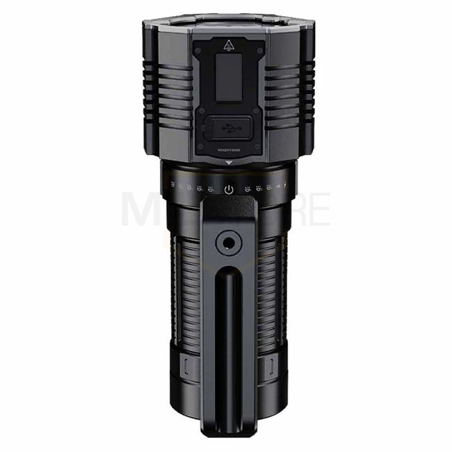 The Fenix LR60R merges a spotlight with flood lighting and delivers up to 21,000 lumens. It has a beam throw of approximately 1,085 meters in spot mode. A mechanical rotary dial enables rapid mode changes, while an OLED screen shows runtime, battery level, and selected mode. It is powered by a replaceable battery pack that can be USB‑C charged.