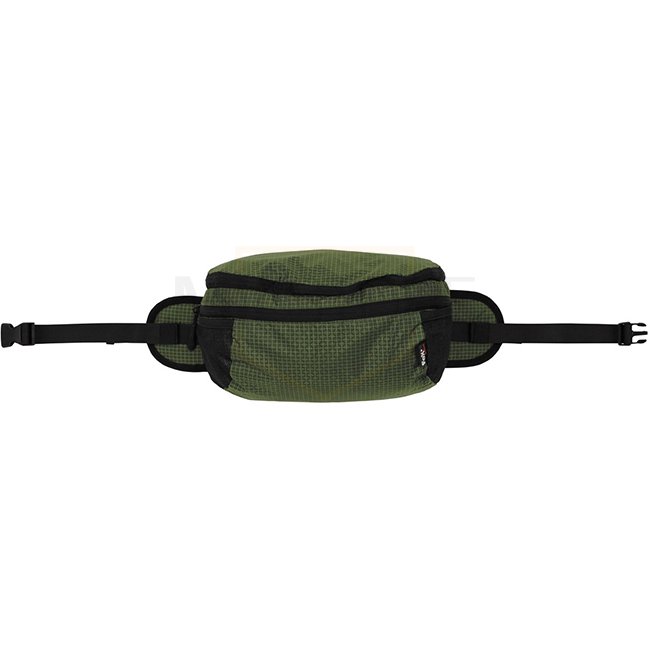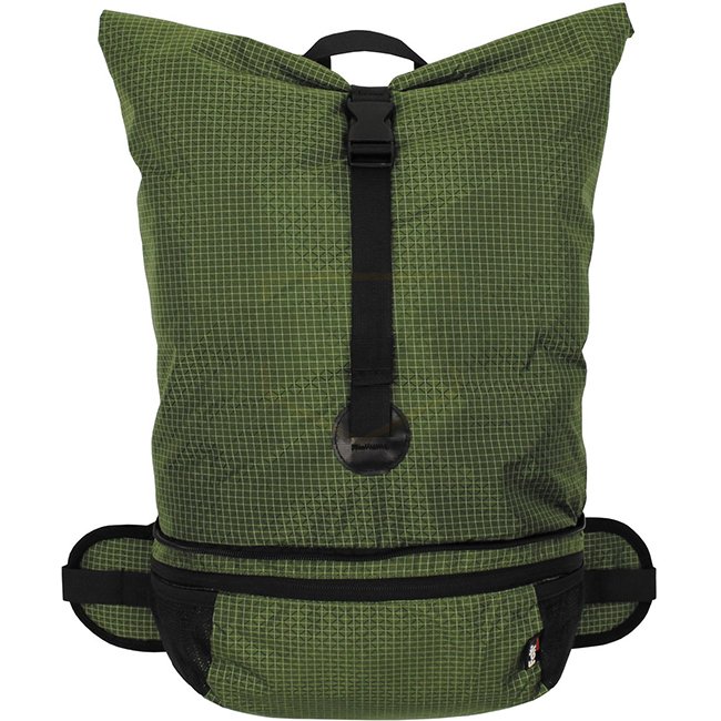 Foldable Ripstop Backpack 35L, Olive color. Can convert to hip bag. Adjustable straps, multiple compartments. Lightweight nylon material. Dimensions: 40x48x15 cm (main), 29x13x16 cm (hip bag). Weight: 325 g.