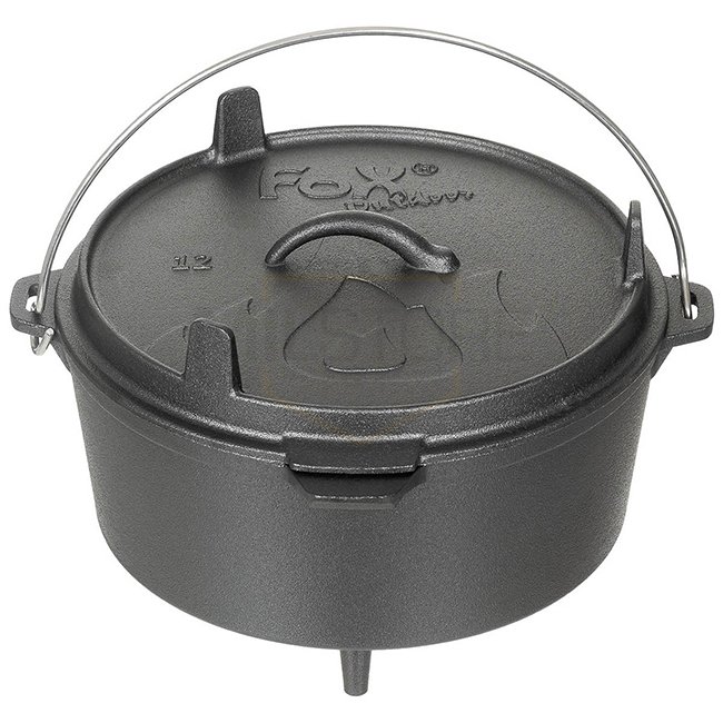 FoxOutdoor Cast Iron Pot Dutch Oven 57 l: Pot and lid with 3 feet, foldable bail handle, lid usable as pan, small recess for thermometer. Capacity: 5.7 l. Dimensions: 35 x 16 cm. Material: Cast Iron.