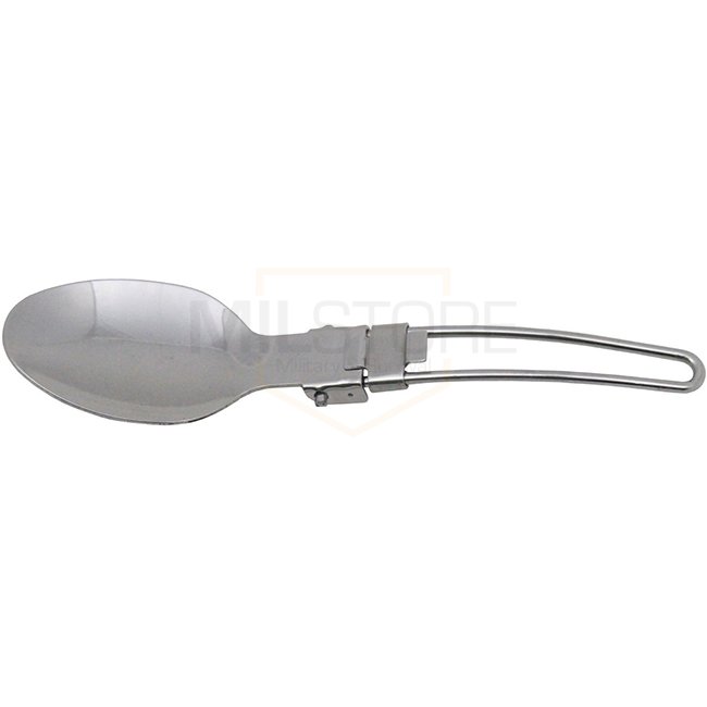 Foldable spoon made of 100% stainless steel. Length: 16cm unfolded, 10cm folded. Lightweight at around 30g. Convenient for outdoor activities.
