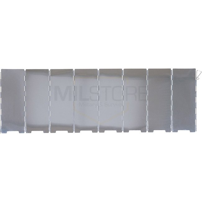 Windscreen for outdoor stoves, also as splatter guard. Features 2 ground brackets, includes transport bag. Made of 100% aluminium. Lightweight and foldable design.