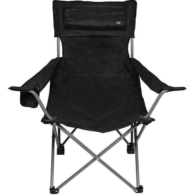 FoxOutdoor Folding Chair Deluxe - Black is a stable and comfortable folding chair with a detachable head part, integrated bottle holder, and a transport bag. Seat height: ca. 40 cm, max. load: ca. 110 kg. Ideal for outdoor activities. Material: Cover - 10