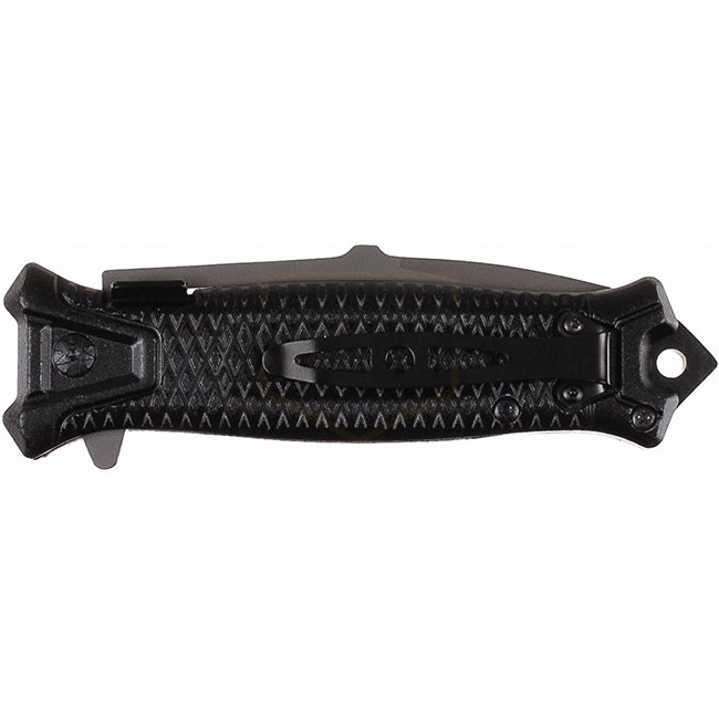 FoxOutdoor Jack Knife Snake - Black: High-quality folding knife with a sleek design and practical features. Grey blade with smooth edge, flipper opener, linerlock, and textured metal handle with fastening eyelet and glass breaker. Total length 23 cm, blad