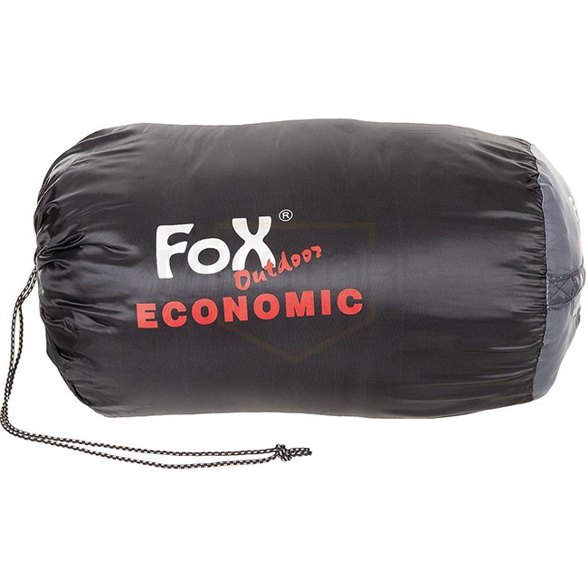 FoxOutdoor Mummy Sleeping Bag Economic in Black/Grey. Temperature range -4¯C to +18¯C, top 2-way zip, hood-shaped head part, adjustable shoulder area, ventilation loops, packing bag included. Dimensions 220 x 75 / 35 cm. Weighs 1.2 kg.