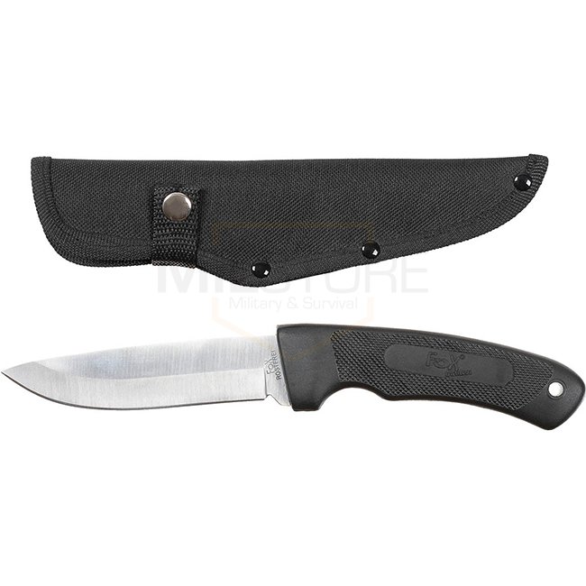 FoxOutdoor Outdoor Knife Hunter - Black. Ergonomic design, textured rubber handle, nylon sheath, Total length: 25 cm, Blade: 11.5 cm, Weight: 150 g.