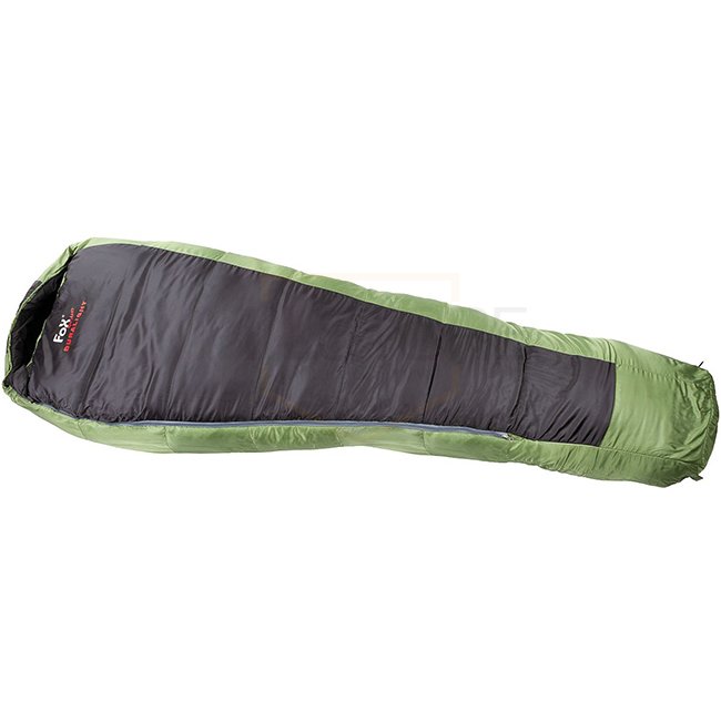 FoxOutdoor Sleeping Bag Duralight - Black / Olive: Lightweight sleeping bag with temperature range of +2¯C to +18¯C. Features top 2-way zip, hood-shaped head part, adjustable shoulder area, bottom loops for ventilation, and packing bag with compression st