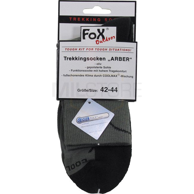 Stay comfortable on your adventures with FoxOutdoor Trekking Socks ARBER. COOLMAX blend ensures a gentle foot climate. 40% Polyester, 40% Cotton, 17% Nylon, 3% Elastane.