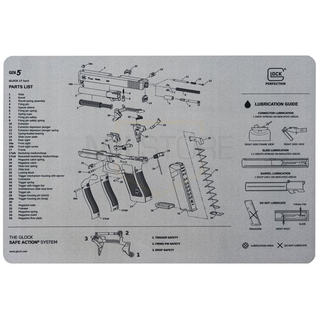 Maintain your GLOCK GEN5 pistol with ease using this official disassembly mat. Designed to provide a clean and organized workspace, it features a detailed parts list specific to the GEN5 model.