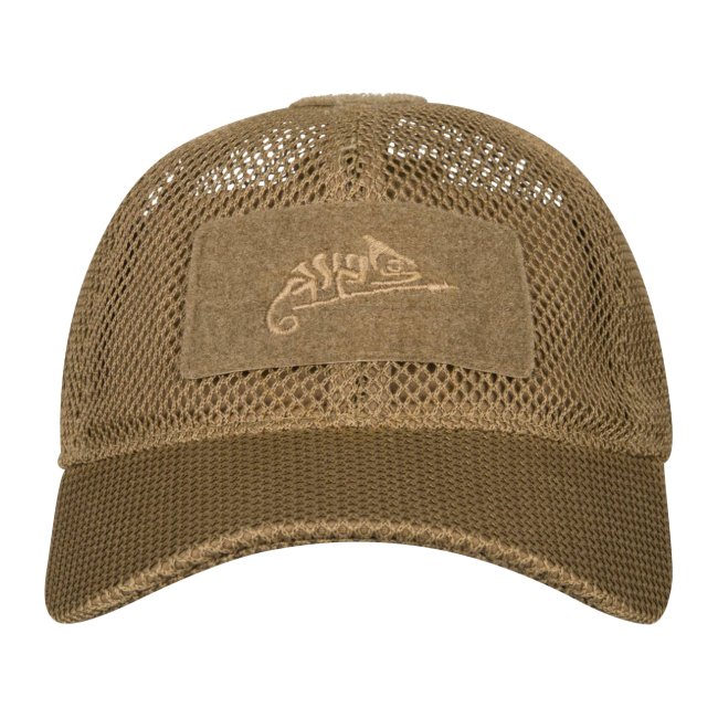 Adjustable Coyote mesh cap with velcro panels for ID/morale patches. Ideal for hot weather, compatible with LE/Mil headgear. Breathable, lightweight, features various velcro panel sizes. Material: 100% Polyester. Weight: 80g. Adjustable strap size: 8 x 2.