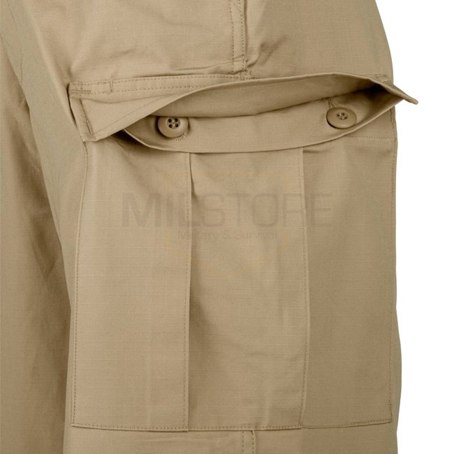 The Helikon-Tex BDU Shorts in Khaki, XS size, are perfect for hot weather. Made of 100% Cotton, they feature an adjustable waist, reinforced seat, front and back pockets, and thigh cargo pockets with buttoned flaps. Weighing only 466g, these shorts are co