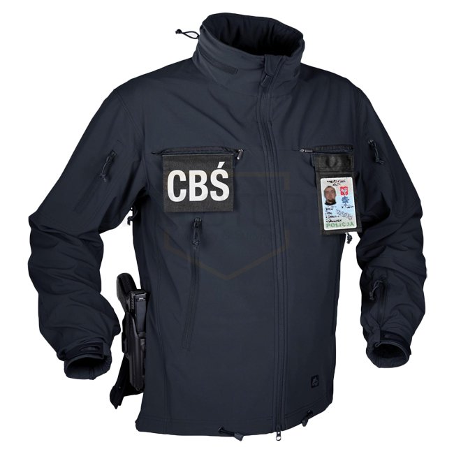 The Helikon-Tex Cougar Shark Skin Jacket in Navy Blue - 3XL is a high-performance outer layer designed for maximum protection against wind and light rain. It features a lightweight construction with a foldable hood, Quick Side Access™ system, and multiple