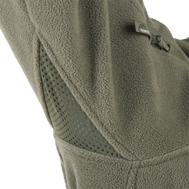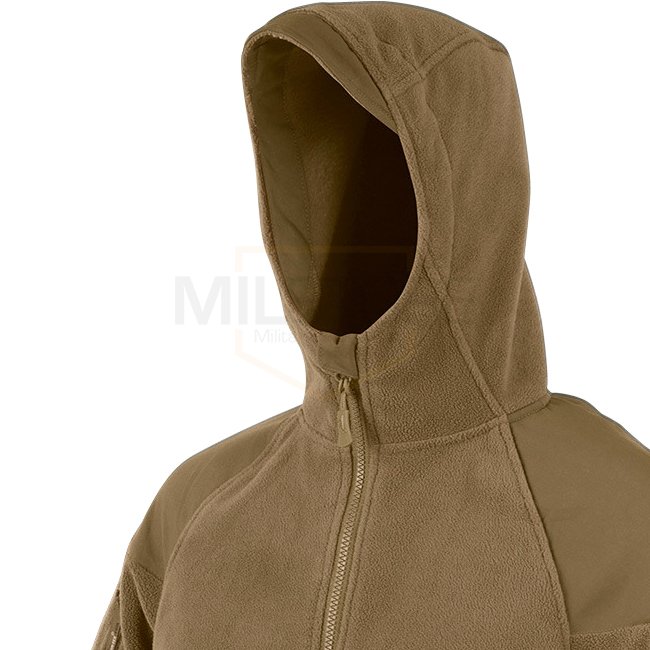 Cumulus Heavy Fleece Jacket - Coyote - 2XL. Polyester material, 750g weight. Two-way main zipper, external zippered pockets, internal chest pockets, velcro panels on sleeves, visored hood, elastic sleeve cuffs, nylon reinforcement patches, ventilation ope