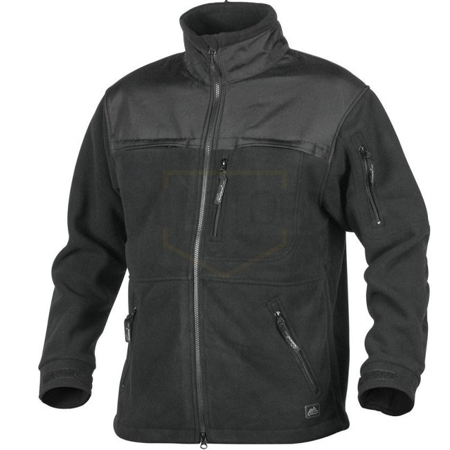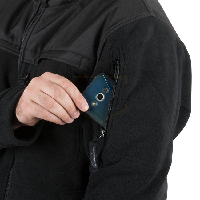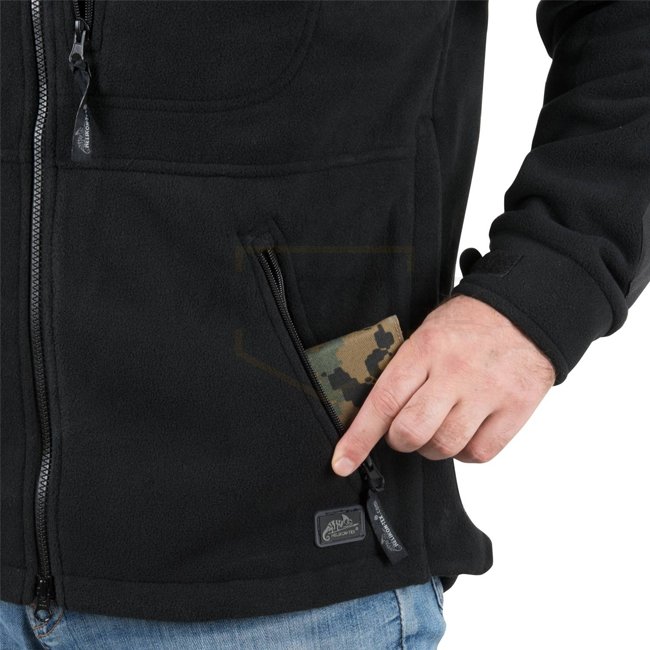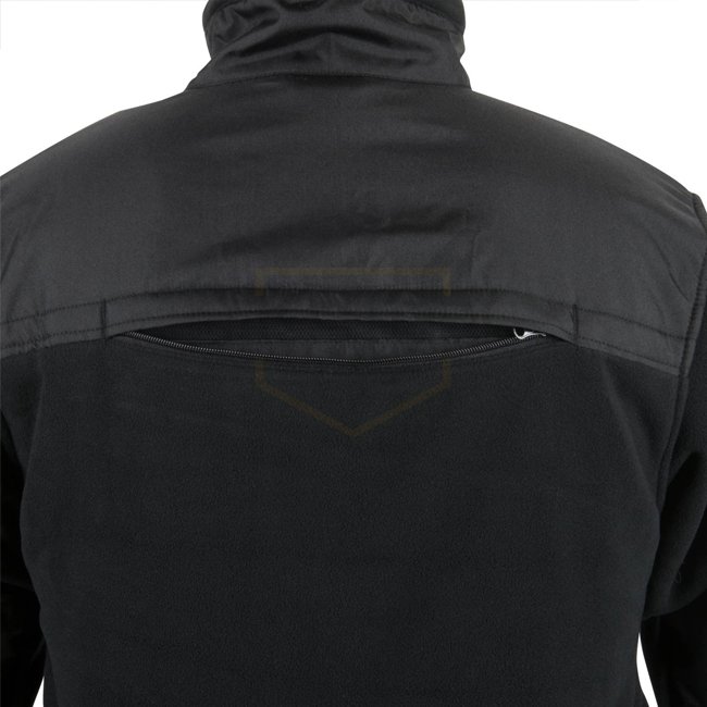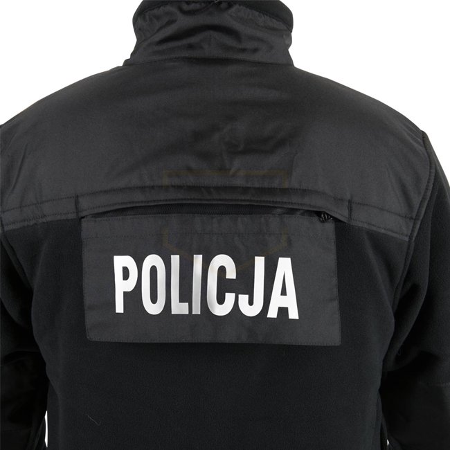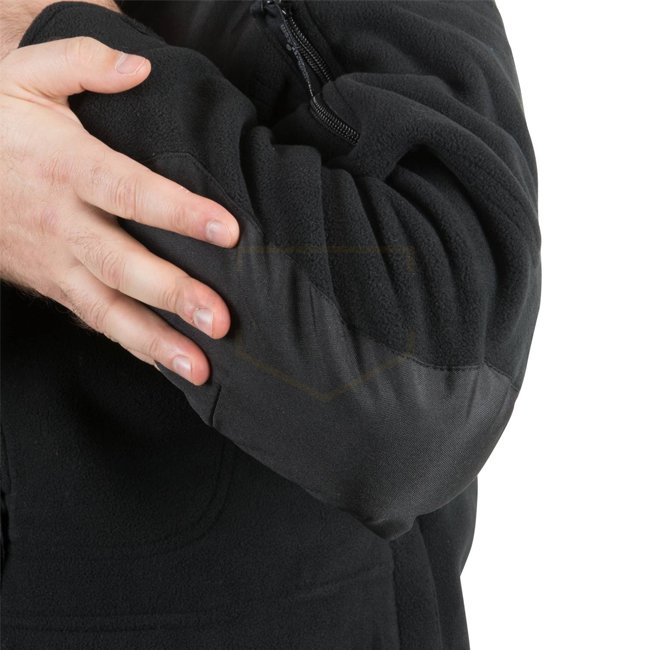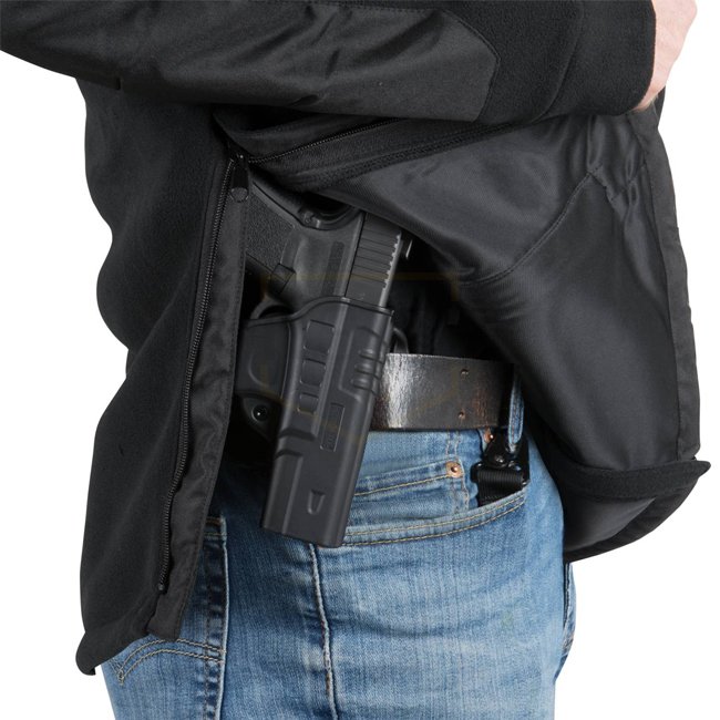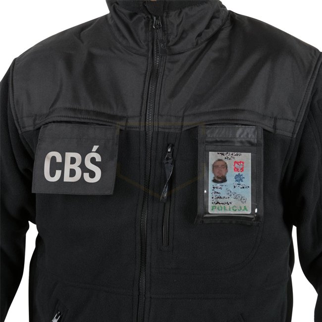 "Defender is a duty fleece jacket which comes only in black. This apparel is strictly designated for Law Enforcement and Security Operators. The design features three basic pockets, shoulder and elbow reinforcements. The construction is equipped with three concealable ID panels. Two include blank ID panels allowing user customization by printing or embroidering names on them. Composed Quick Side Access™ provides easy grab of pistol and other duty belt mounted gear. Defender features Velcro panels on sleeves and chest.
