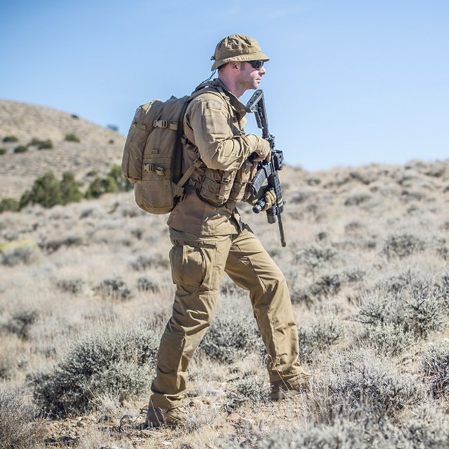 The pants have a loose, profiled cut. The belt is fastened with hook & loop tape that enables additional fine adjustment. Wide beltloops support belts up to 45mm wide, even with holster or magazine pouches installed. Gussets made of elastic VersaStretch fabric are placed on the back and in the crotch area for additional freedom of movement. Classic hip pockets have reinforcements on the edges to avoid being damaged by knife clips. Additional back pockets with reinforced edges will fit larger items like magazines. On the thighs large, spacious, buttoned cargo pockets can be found. On the lower legs smaller closed pockets with hook & loop closure will fit essentials like field dressings or a tourniquet.