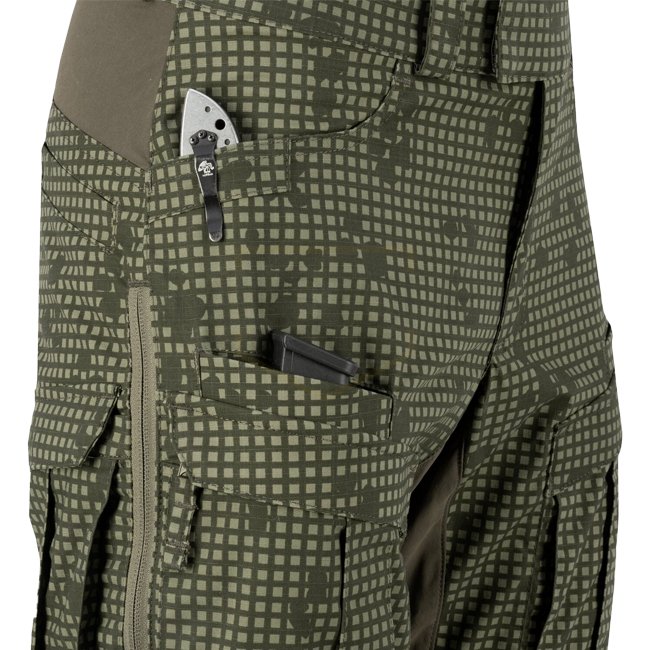 Inserts made of Versastrech material were used in key areas (waist, crotch and back of the knee). It dries quickly and is highly breathable. The knee area is reinforced with 500D Cordura fabric with slits for protective inserts. Thanks to additional cords located under the knee and at the bottom of the leg, the pants can be easily adjusted to the leg.