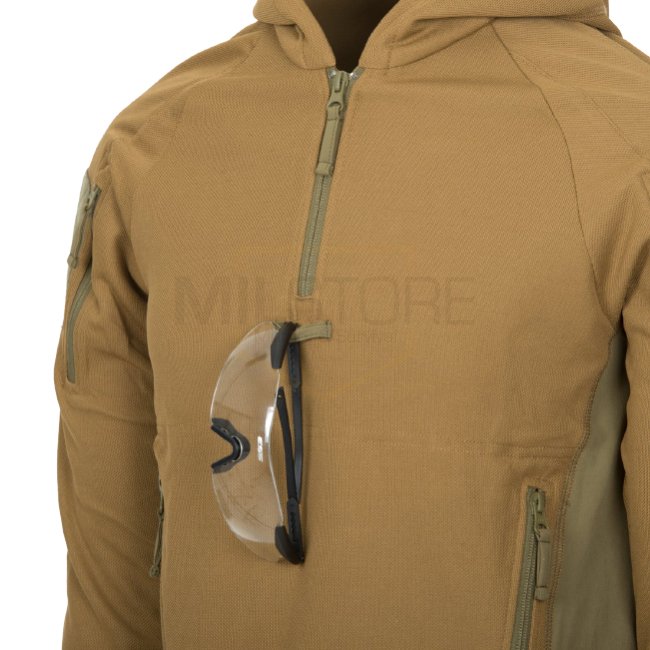RANGE HOODIE is a tactical hoodie designed by shooting specialists. Its cut and the fabrics used will allow for comfortable use of the shooting equipment even in bad weather conditions.An extended cut that allows this sweatshirt to be tucked into pants, an anatomically cut hood and a zipped kangaroo pocket are the elements that distinguish RANGE HOODIE from classic combat shirts or POLO RANGE shooting shirts. However, a combination of elastic and tear-resistant materials, known from the latter, has been used, making this hoodie suitable for intensive and demanding work with weapons. Mesh sewn under the armpits will provide better ventilation during dynamic training, and the small zipped pockets on the shoulders will allow you to conveniently carry the necessary equipment.The RANGE HOODIE is a great replacement for the POLO RANGE on cold and rainy days. In combination with LVL 1 thermal underwear and HYBRID TACTICAL PANTS pants, it will allow you to work at the shooting range all year round.