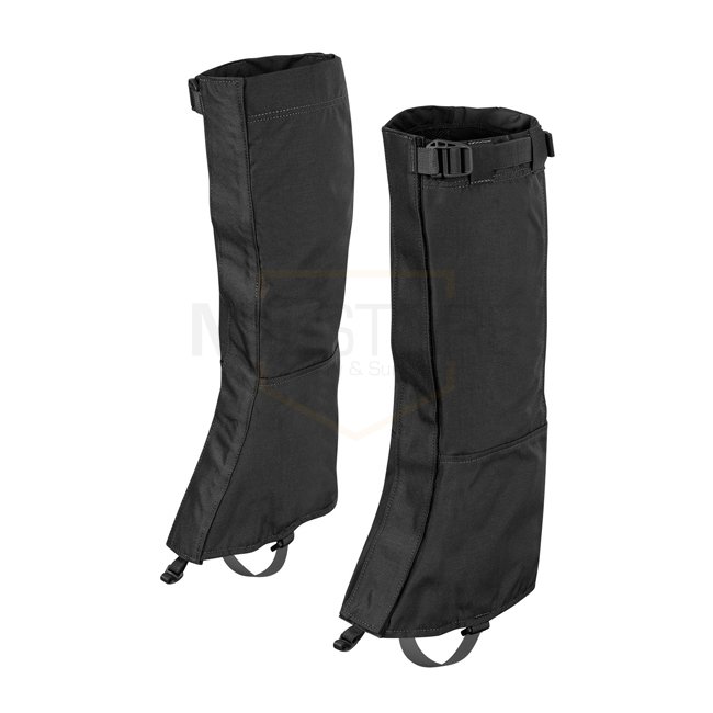 Helikon-Tex Snowfall Long Gaiters in Black. VersaStretch panels, Velcro closure, Length-adjustable stirrup strap made of Hypalone, Front hook for lace-attachment, Adjustable draw cord. One size fits all. Nylon material, 280g.