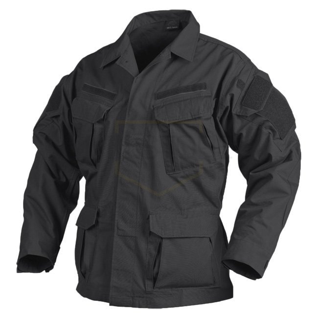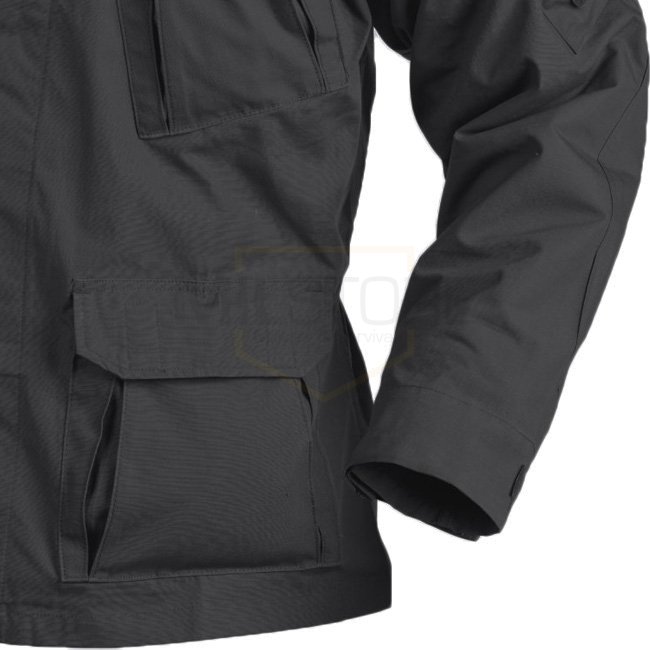The Helikon-Tex Special Forces Uniform NEXT Shirt in black, size S, merges classic uniform design with practical features. It boasts a casual collar, durable button fastening, and six spacious pockets with Velcro flaps for gear protection. Reinforced elbo