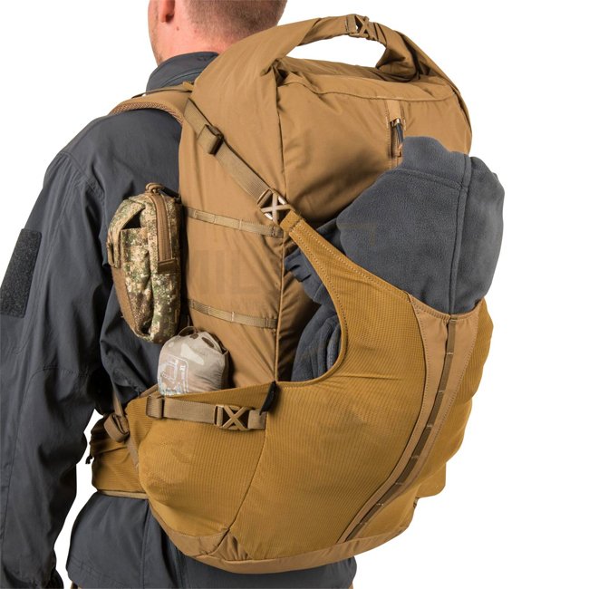 Lightweight Cordura backpack with profiled shoulder straps, YKK zippers, and 40L capacity. Features rolltop, front zipper access, side mesh pockets, hip belt mesh pockets, and Molle Lite sides. Also includes small-item pocket, elastic chest strap, beavert