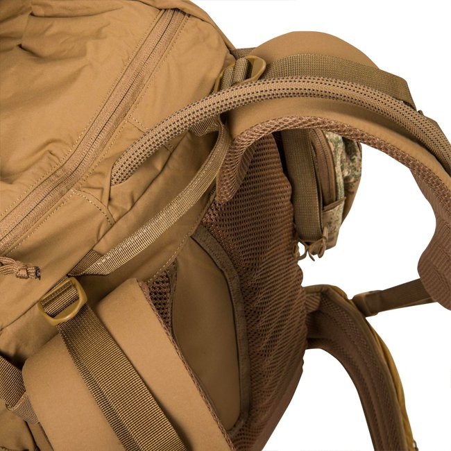 Helikon-Tex Summit Backpack in Olive color, made of lightweight Cordura fabric with YKK zippers and Woojin buckles. Features profiled shoulder straps, hip belt, rolltop, front and side access points, mesh pockets, and MOLLE Lite on sides. 40l capacity, 55