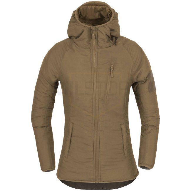 "Lightweight and insulated Wolfhound hoodie jacket for women. DWR layer protects from light rain, while Climashield Apex insulation ensures thermal comfort even when wet. Nylon fabric enhances wind resistance. Equipped with elastic hem and fleece-lined hi