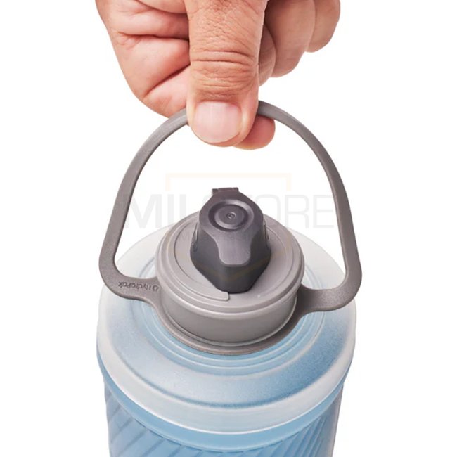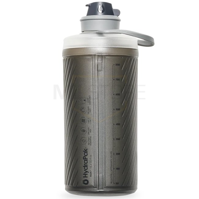 The HydraPak Flux combines the structure of a hard bottle with the flexibility of a soft flask, reducing weight by 50%. It features a dust cover and twist-drink nozzle for quick hydration on the go, along with a bail handle for secure carrying in hand or on your pack. While it stands upright like a rigid bottle, the Flux easily compresses to pocket size once empty.