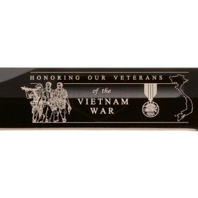 This knife has been laser engraved with carefully designed blade art meant to honor the Veterans of the Vietnam War. Tang stamped U.S. ARMY. Leather sheath included. Made in the USA.