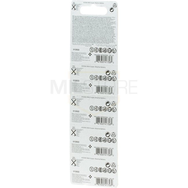 Kodak LR48 / AG5 10pcs - Set of 10 LR48 / AG5 alkaline batteries by Kodak, designed to provide long-lasting power for various devices.