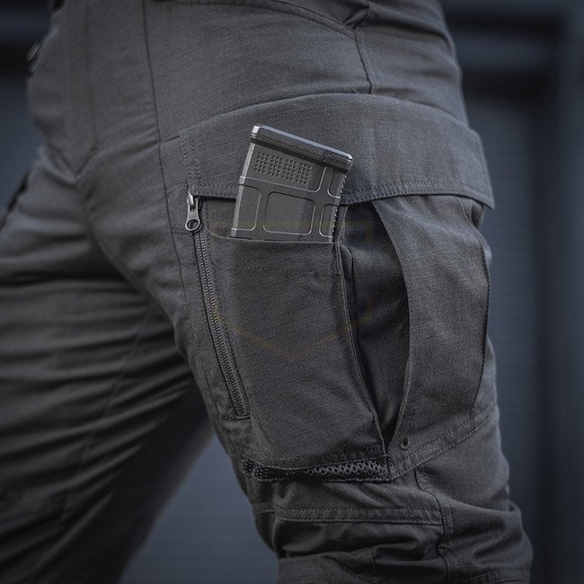 The cargo pocket with an asymmetric flap is equipped with an additional patch pocket, which can fit an M4 or AK magazine. The cargo pocket itself is quite roomy. It has two folds, due to which its size can be increased for carrying bulky items. In addition, the cargo pocket is equipped with a second zippered entrance, which allows to access its contents from a sitting position. The bottom of the cargo pockets has a mesh for adimtional ventilation.