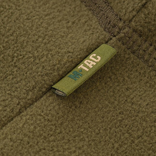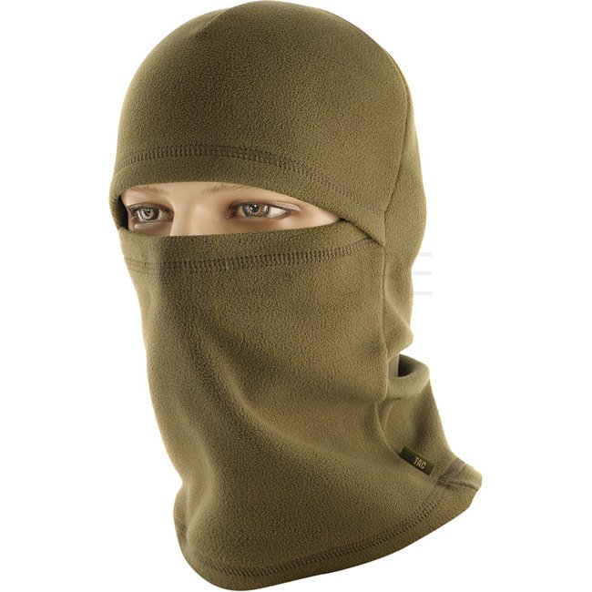 Fleece balaclava in olive for cool weather. Snug fit around face and neck. Versatile use as balaclava, mask, scarf, or hat. Material: 100% polyester.