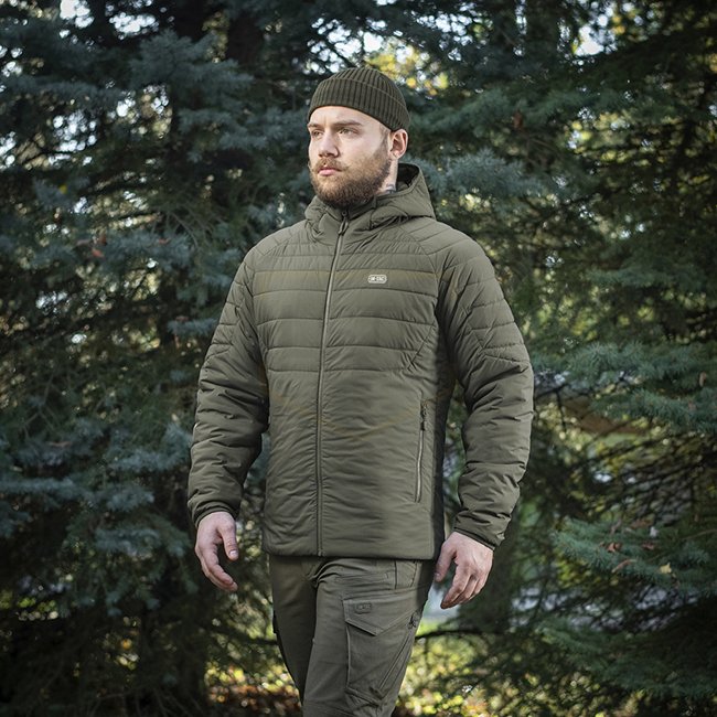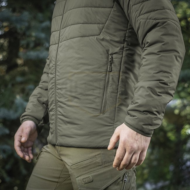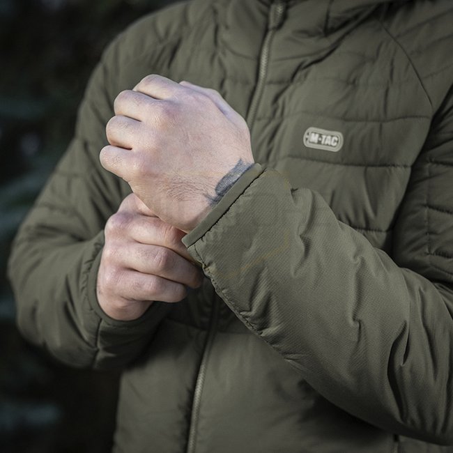 M-Tac Berserk Jacket - Olive - 2XL: Stylish demi-season jacket made of water-repellent nylon fabric from Toray. Insulated with Austrian G-Loft for high thermal insulation. Features zippered pockets, elastic cuffs, and reflective logo. Minimalistic design