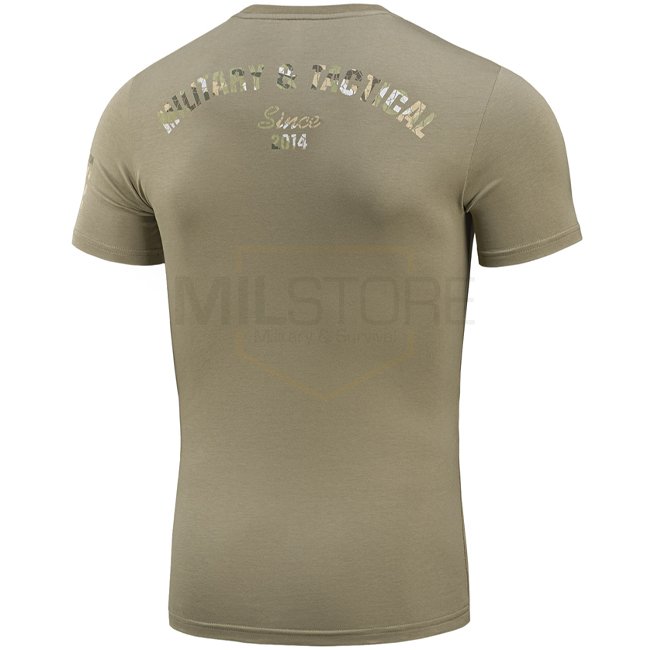 M-Tac Logo T-Shirt in Tan, XS size. Made of 93% cotton and 7% elastane, weighing 190g.