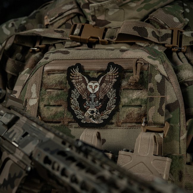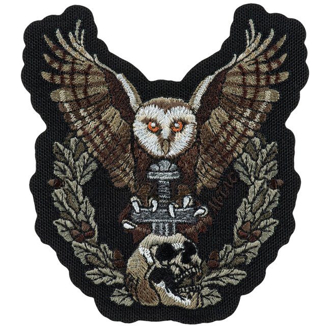 M-Tac Owl Embroidery Patch - Black: high-quality Cordura 500D front with hook surface back. Dimensions 85x95mm.