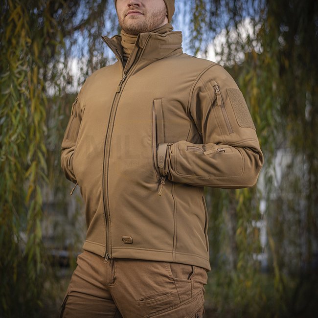 M-Tac Soft Shell Jacket - Tan - M - with interlayer polyurethane membrane for weather protection and thin fleece layer. Lightweight, dual-layer design provides wind & weather protection. Moisture-deflecting & dirt-deflecting top fabric. Comfortable and st