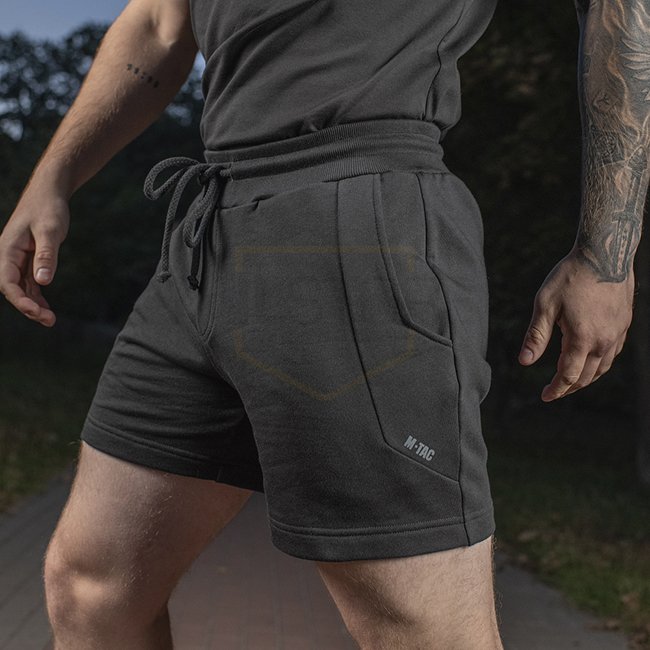 Comfortable Sport Fit Cotton Shorts in black color. Made from 100% cotton, ensuring sweat-free comfort. Features elastic band for secure fit, two side pockets with stylish shape, and brand logo on the left pocket. Ideal for sports and daily wear in hot we