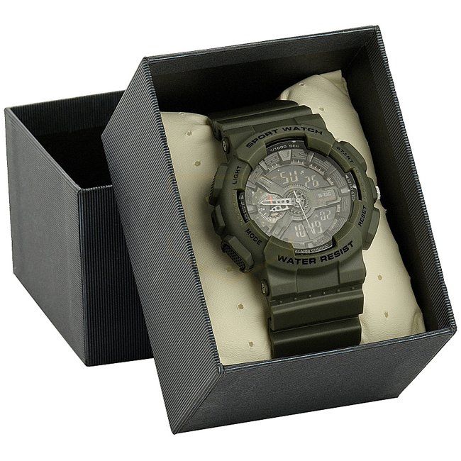 M-Tac Sport Watch - Olive: Stylish Sport Watch with durable polycarbonate case and glass, waterproof, and multifunctional with 12/24 time format, stopwatch, alarm clock, automatic calendar, and LED backlight. Perfect for outdoor activities and sporty styl