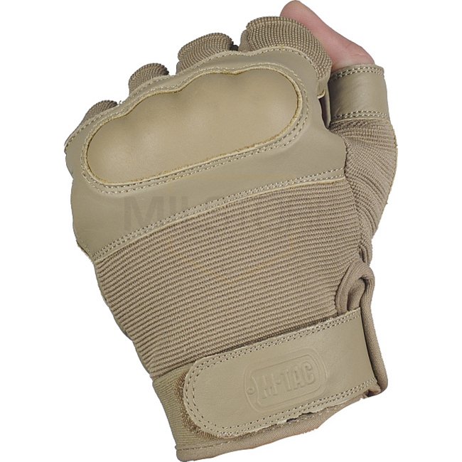 M-Tac Tactical Assault Gloves Fingerless Mk.4 - Khaki - M are designed for weapon handling with reinforced leather palm pads, knuckle cushioning, and Velcro closure for a secure fit. Made of polyester and leather.