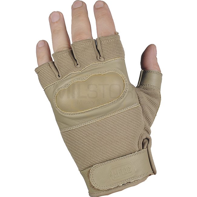 M-Tac Tactical Assault Gloves Fingerless Mk.4 in Khaki XL with reinforced palm pad made of genuine leather for weapon handling. Features cushioning pads over knuckles and Velcro fastener closure. Material: Polyester/leather.