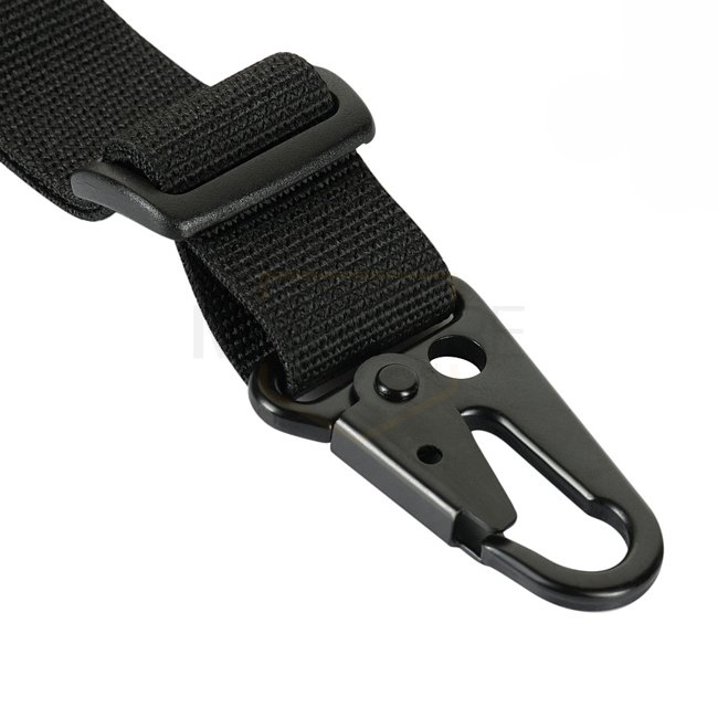 This sling model provides both a two-point and a single-point fastening system. To use the belt in a standard two-point application, the sling is attached to the rear near the stock or to the QD-socket, and the metal carabiner to the front of the rifle. To modify the weapon sling into a single-point one, it is enough to hook the carabiner on the D-ring located near the soft shoulder pad. An innovative metal buckle with a T-shaped lever will ensure quick adjustment of the length.