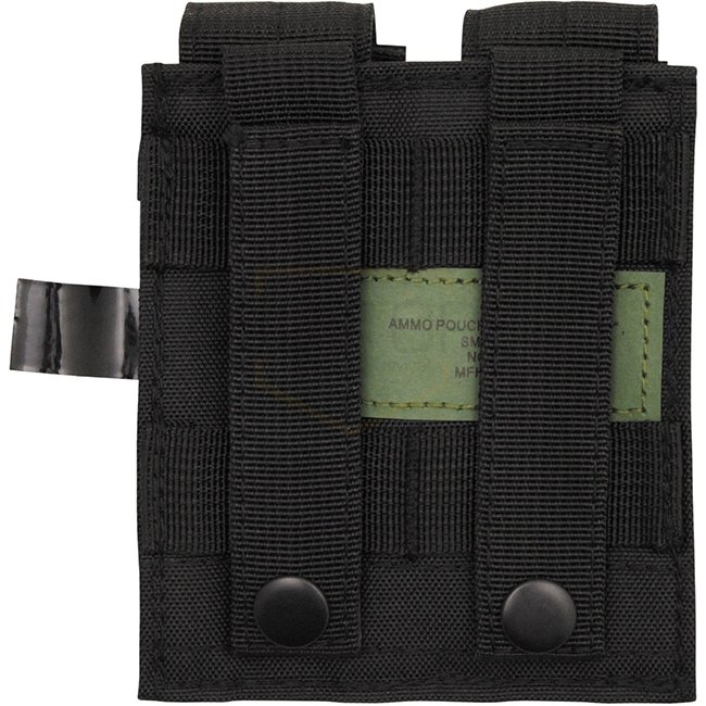 High-quality black MFH Ammo Pouch Double Small MOLLE with velcro lid flaps, Molle fastening loops, and press buttons. Dimensions: 11 x 12.5 x 4 cm (W x H x D).